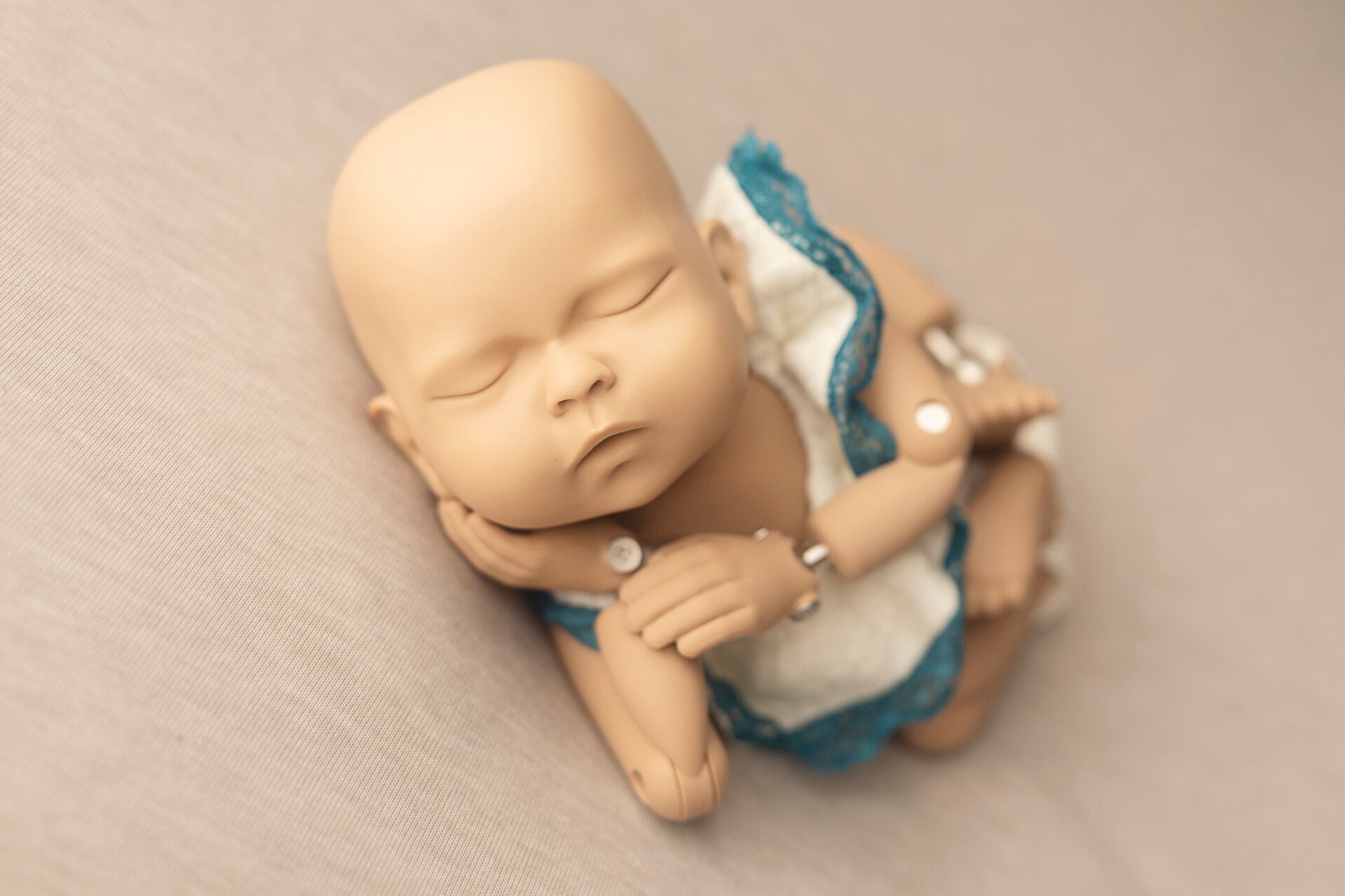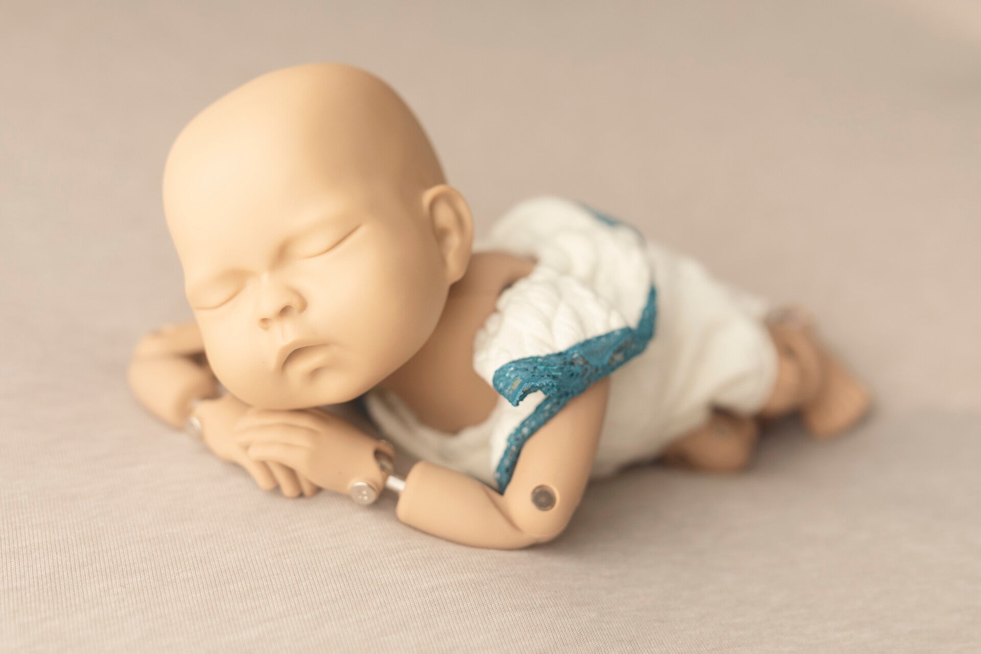 Évoquant les premiers matins d’hiver, cette barboteuse mêle la douceur d’un jersey matelassé blanc cassé à la fraîcheur cristalline d’une dentelle bleue givrée.